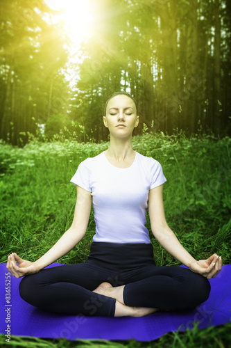 Beautiful young girl meditating in the forest