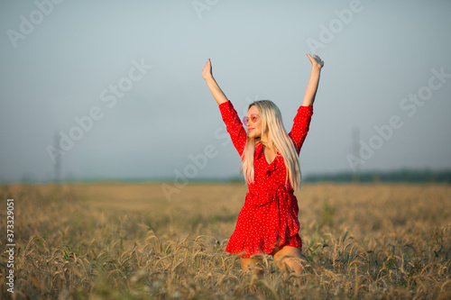 beautiful young woman in a red dress in a field in summer with hands raised up