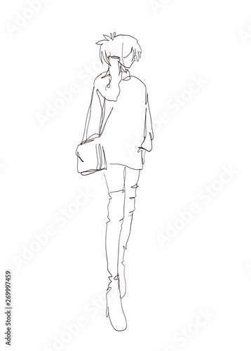 Beautiful young woman in boots and short dress. Hand drawn fashion girl. Fashion model posing. Sketch. Vector illustration.
