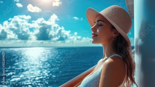 Beautiful young woman in hat enjoying vacation on the deck of a luxury yacht in the sea on a beautiful sunny summer day. Trip and travel concept