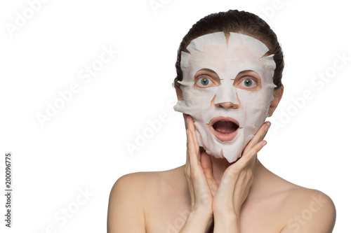 Beautiful young woman is applying a cosmetic mask on a face on a white background