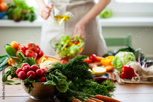 Beautiful young woman preparing delicious fresh vitamin salad with olive oil. Concept of clean eating, healthy food, low calories meal, dieting, self caring lifestyle. Colorful vegetables. Close up
