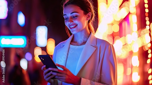 Beautiful young woman using a smartphone on a neon-lit city street, smiling, pastel colors.