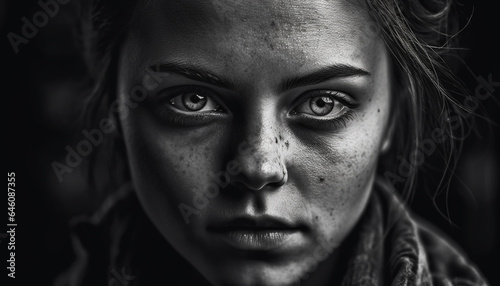 Beautiful young woman with brown hair looking at camera outdoors generated by AI