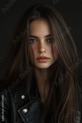 Beautiful young woman with long brown hair, wearing black leather jacket against dark background and looking at the camera with hazel eyes, portrait.