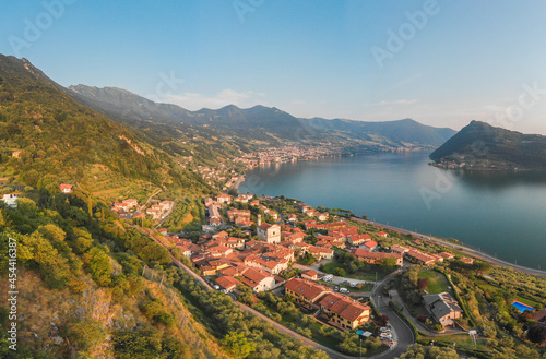 Beautifull aerial panoramic view from the drone to the Iseo lake and its village, Lombardy, Italy