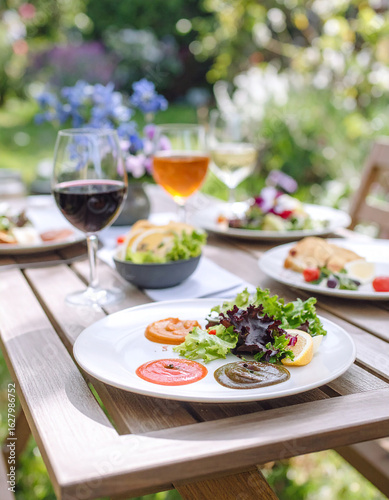 Beautifully Plated Meal on Ceramic Dish. Outdoor Garden Dining.