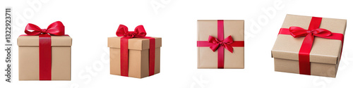 Beautifully wrapped holiday birthday or Christmas gift boxes with red ribbon and bow on a neutral brown or beige background Festive gift packaging design for special occasions and