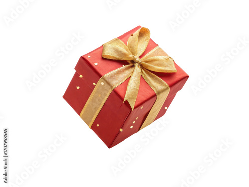 Beautifully wrapped red gift box adorned with golden ribbon and decorative stars, perfect for festive occasions