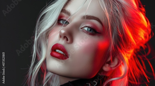 Beauty portrait of a girl with ultra blond hair, showcasing a sophisticated hairstyle and makeup for a fashion and cosmetic concept