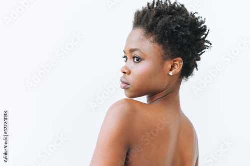 Beauty portrait of beautiful young African American woman in black top isolated on the white background