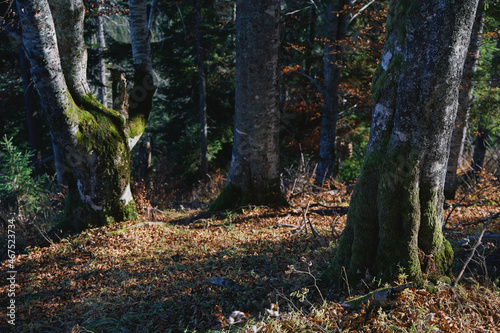 Beech forest in autumn. Yellow leaves on the trees. Ukrainian Carpathian mountains. Autumn in the mountains.