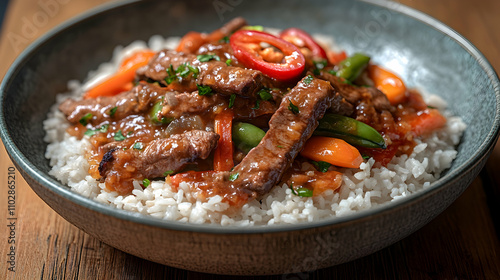 Beef and vegetable stir-fry over rice in a bowl.
