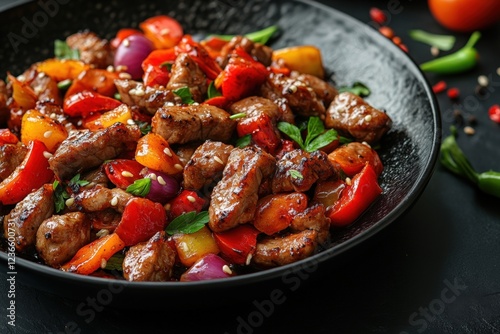 Beef stir-fry with bell peppers, delicious meal.