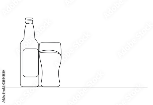 Beer glass and bottle in one continuous line drawing. Isolated on white background vector illustration. Pro vector