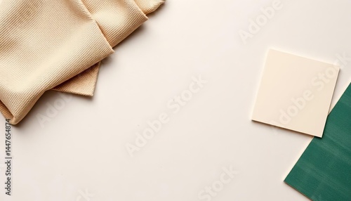 Beige, brown, green textile, paint, tile samples arranged on flat surface, copy space, template, fabric