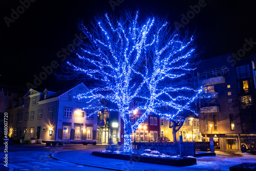 Beleuchteter Baum auf dem Víkurgarður in Reykjavik. Zur Weihnachtszeit, beleuchten die Isländer ihre Häuser, Fester und Bäume, um der langen Dunkelheit im Winter ein wenig Lichts entgegenzusetzen.