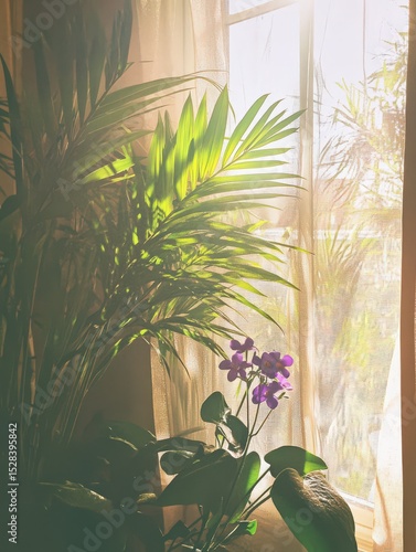 Beneath the gentle warmth of natural light a vibrant violet flower stands proudly in the foreground complemented by rich green foliage near a sunny window creating an inviting atmosphere