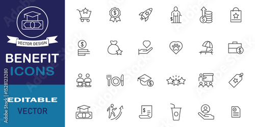 Benefit icon set in line style. Included icons as reward, teamwork, insurance, paid vacation, pension, pay and more symbol collection. Set of 24 line icons related to benefit. Vector illustration.