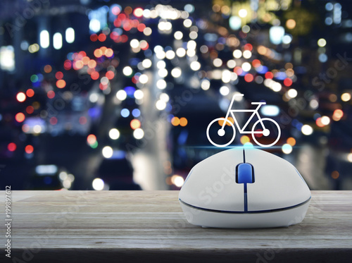 Bicycle flat icon with wireless computer mouse on wooden table over blurred colourful night light city with cars, Business internet bicycle service concept