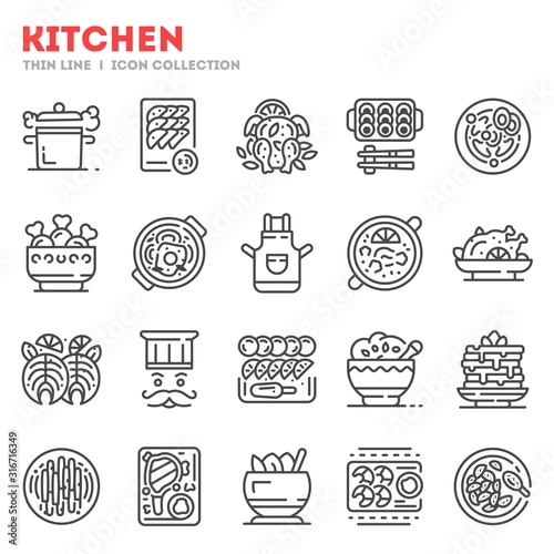 Big set of kitchen equipment, chef supplies thin line icons isolated on white. Cuisine outline pictograms collection, logos. Food, eating, dishes, cookware vector elements for infographic, web.