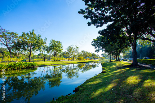 Big trees are planted along the riverbank with reflex of tree in the morning