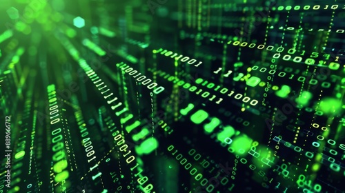 Binary code is rendered in a digital, futuristic style. Green lines and numbers extend into the distance.