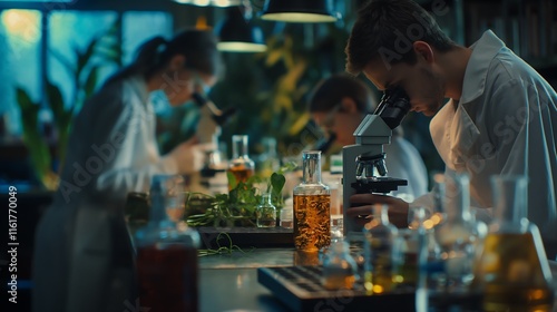 biology lab with microscope slides, specimen jars, and students studying plant and animal cells.