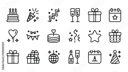 Birthday celebration icons set black line art vector