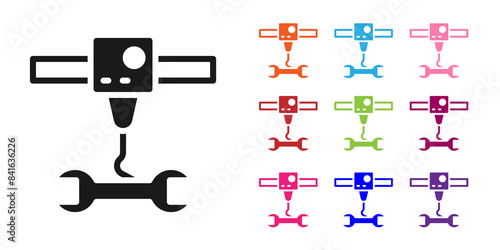 Black 3D printer wrench spanner icon isolated on white background. 3d printing. Set icons colorful. Vector