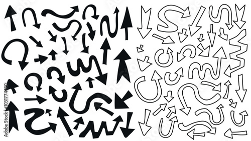 Black and white arrows point in various directions and various arrow shapes, straight, curved, circular, curved