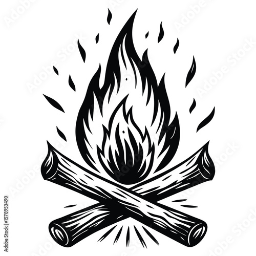 Black and white campfire silhouette flames logs