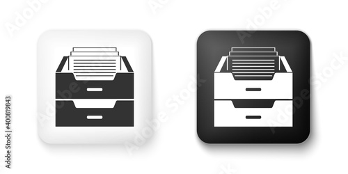 Black and white Drawer with documents icon isolated on white background. Archive papers drawer. File Cabinet Drawer. Office furniture. Square button. Vector.