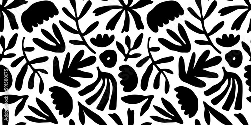 Black and white flower seamless pattern illustration. Children style floral doodle background, funny basic nature shapes wallpaper.