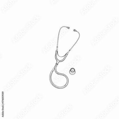 Black and white illustration of a classic stethoscope with chest piece and eartips displayed on a plain white background, symbolizing healthcare and diagnosis.