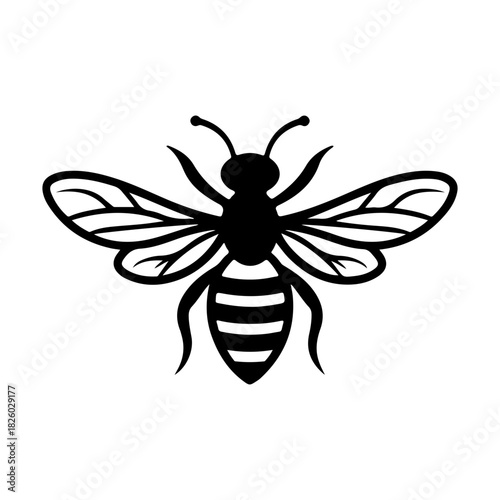 Black and White Illustration of a Stylized Bee with Detailed Wings and Striped Body