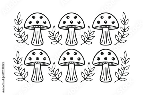 Black and White Illustration of Six Cartoon Mushrooms with Leaves fungi nature