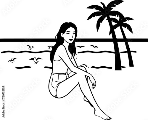 Black and white line art of a beautiful woman relaxing by the beach minimalist peaceful illustration