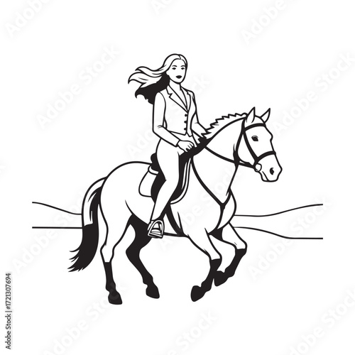 Black and white line art of a beautiful woman with perfect body riding horse elegant minimalist illustration