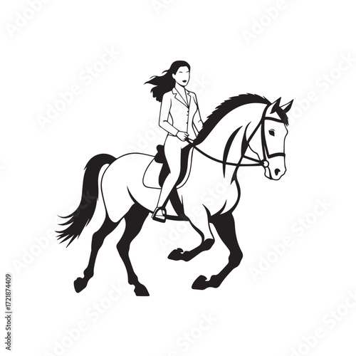 Black and white line art of a beautiful woman with perfect body riding horse elegant minimalist illustration