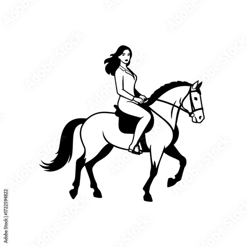Black and white line art of a beautiful woman with perfect body riding horse elegant minimalist illustration