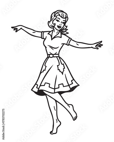Black and white line drawing of a young female dancing with arms extended, wearing a vintage knee-length dress and short hair.
