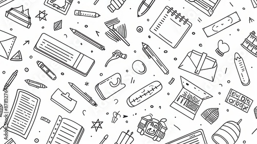 Black and white line drawing of stationery items on the background