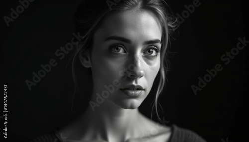 Black and white portrait of a depressed woman with intense eyes, conveying deep emotions and depression.