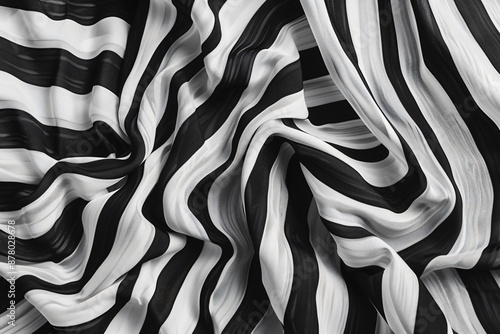 Black and white striped shirt texture, top view. Wavy fabric with vertical lines as background or wallpaper. High resolution flat lay.