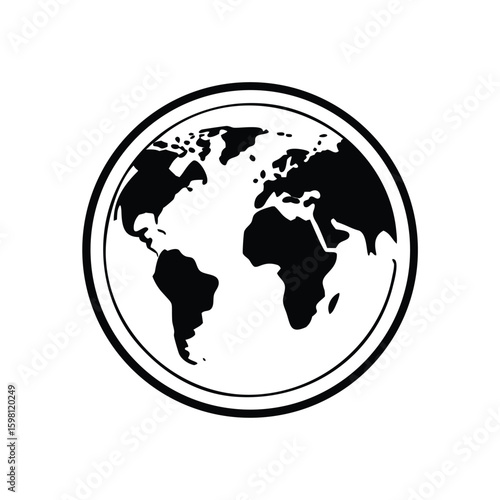 Black and white world map showcases landmasses inside a circular border with transparent background