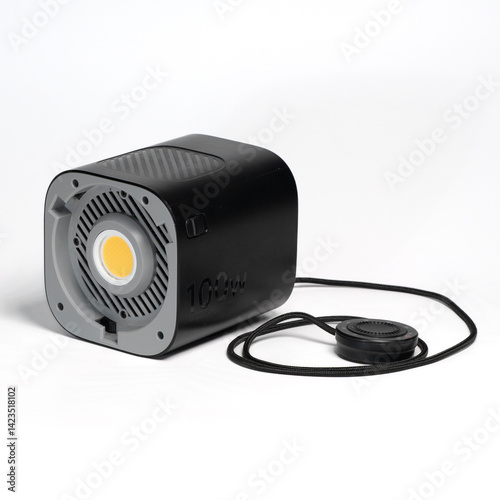 Black Aputure 100d LED light with foot stand and remote controller on white surface