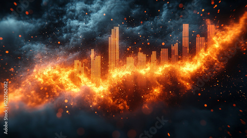 Black bar graph engulfed in flames and sparks with a dark background of digital financial charts minimalistic bright tone modern blurred empty space symbolizing chaos and volatility