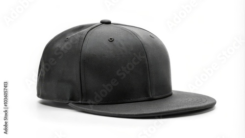 Black baseball cap with blank visor laying on white background