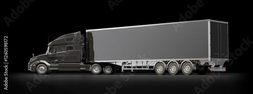 Black big truck with trailer. Studio view on a dark background. 3D illustration